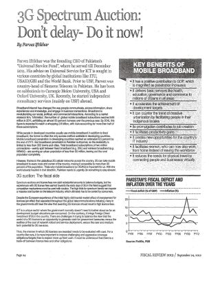 April 11,2012 As a concerned citizen of Pakistan, I would like to urge all those who have anything to do with the ICT sector to do whatever they can, to push and expedite the introduction of mobile broadband (3G technology) I say this because the spectrum auction has been delayed again, albeit for good reasons.